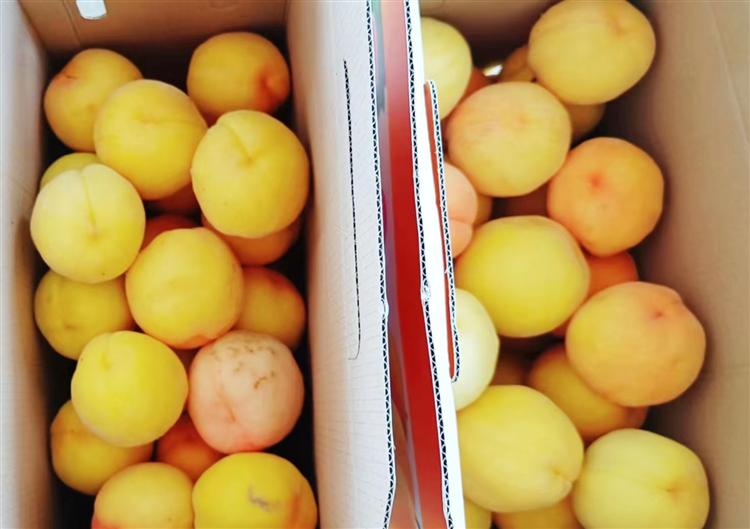 果农们把采摘下的黄蜜桃装箱,准备发往北京上海等地。